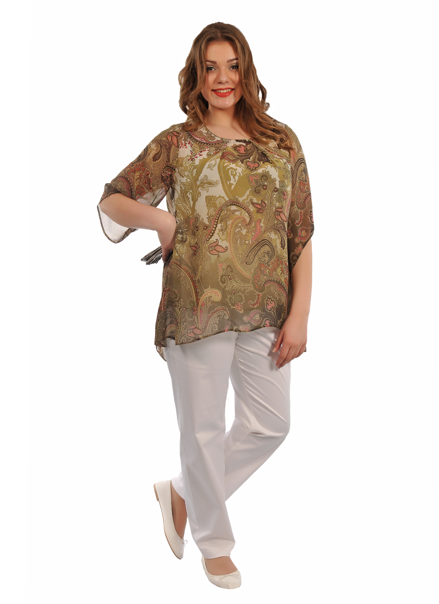 Шифоновая туника свободного силуэта, округлый вырез горловины, рукава длиной до локтя.