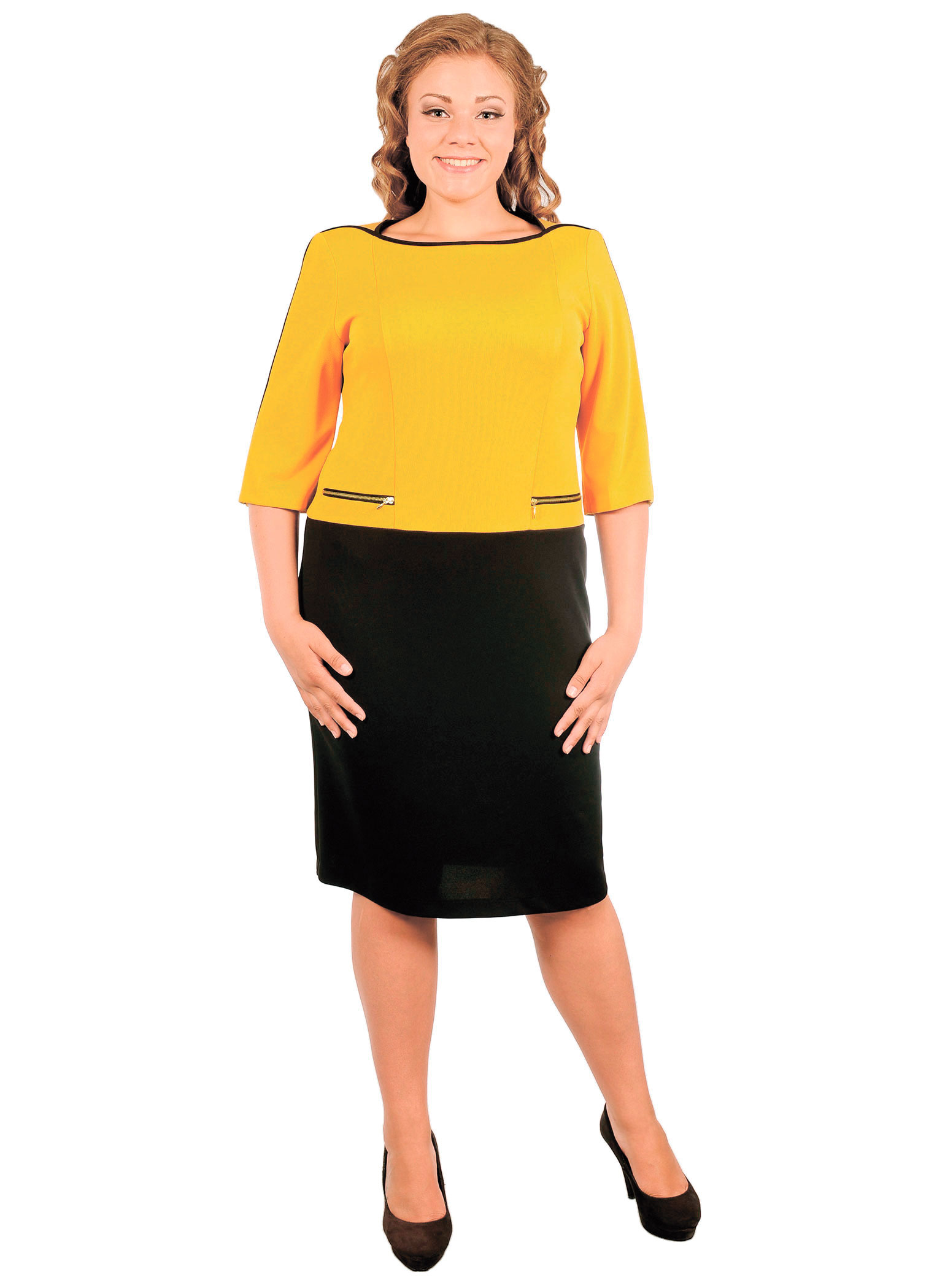 Современное платье прилегающего силуэта широкого возрастного спектра. Это платье может быть в качестве выходного и повседневного наряда. Декоративные металлические замочки цвета латунь - современная изюминка этого платья.