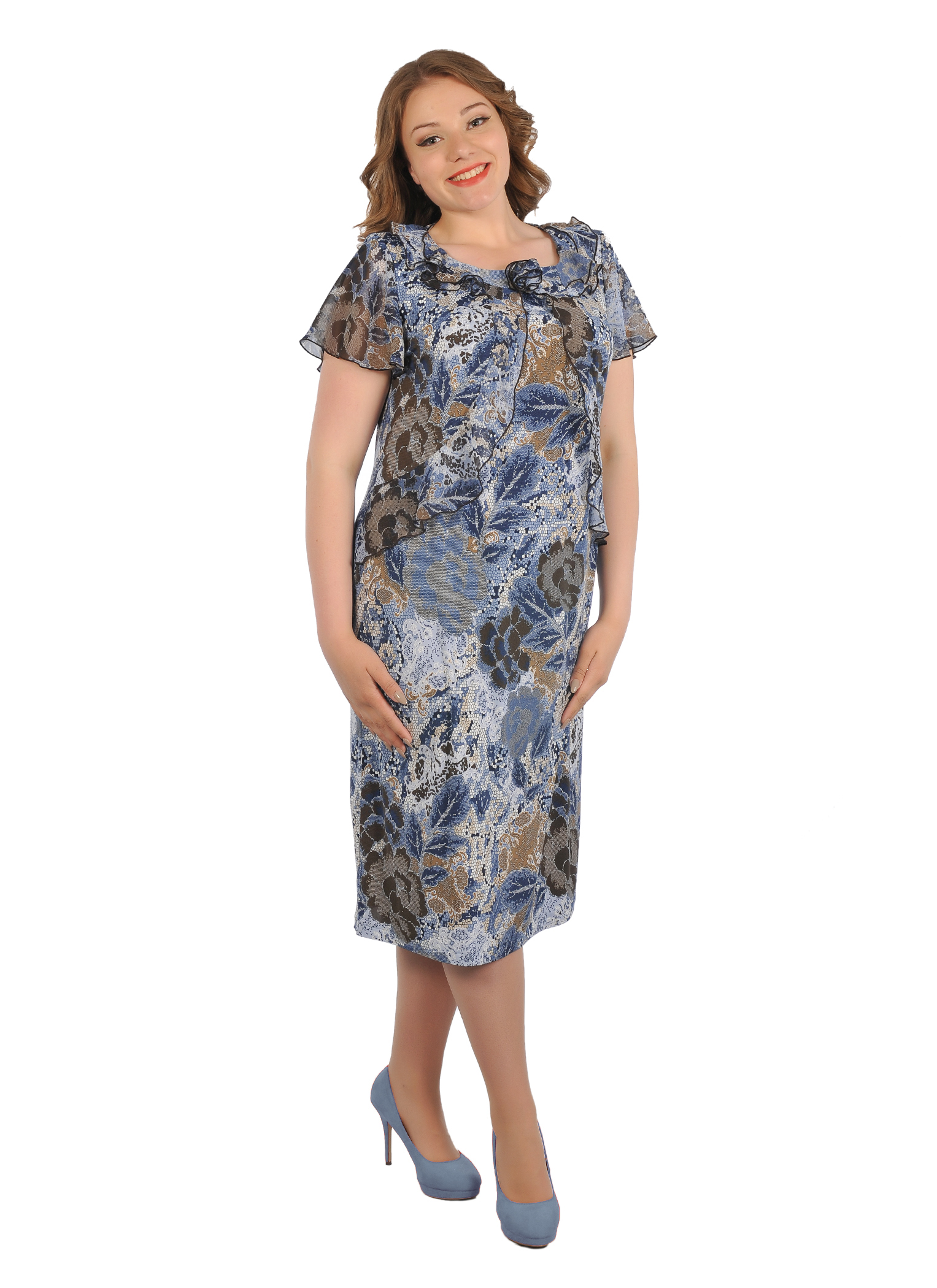 Летнее платье выполнено из вискозы. Модель приталенного силуэта, с округлый вырез горловины украшен рюшами, короткий рукав-крылышко. Платье выполнено в двух цветах - синий и розовый.