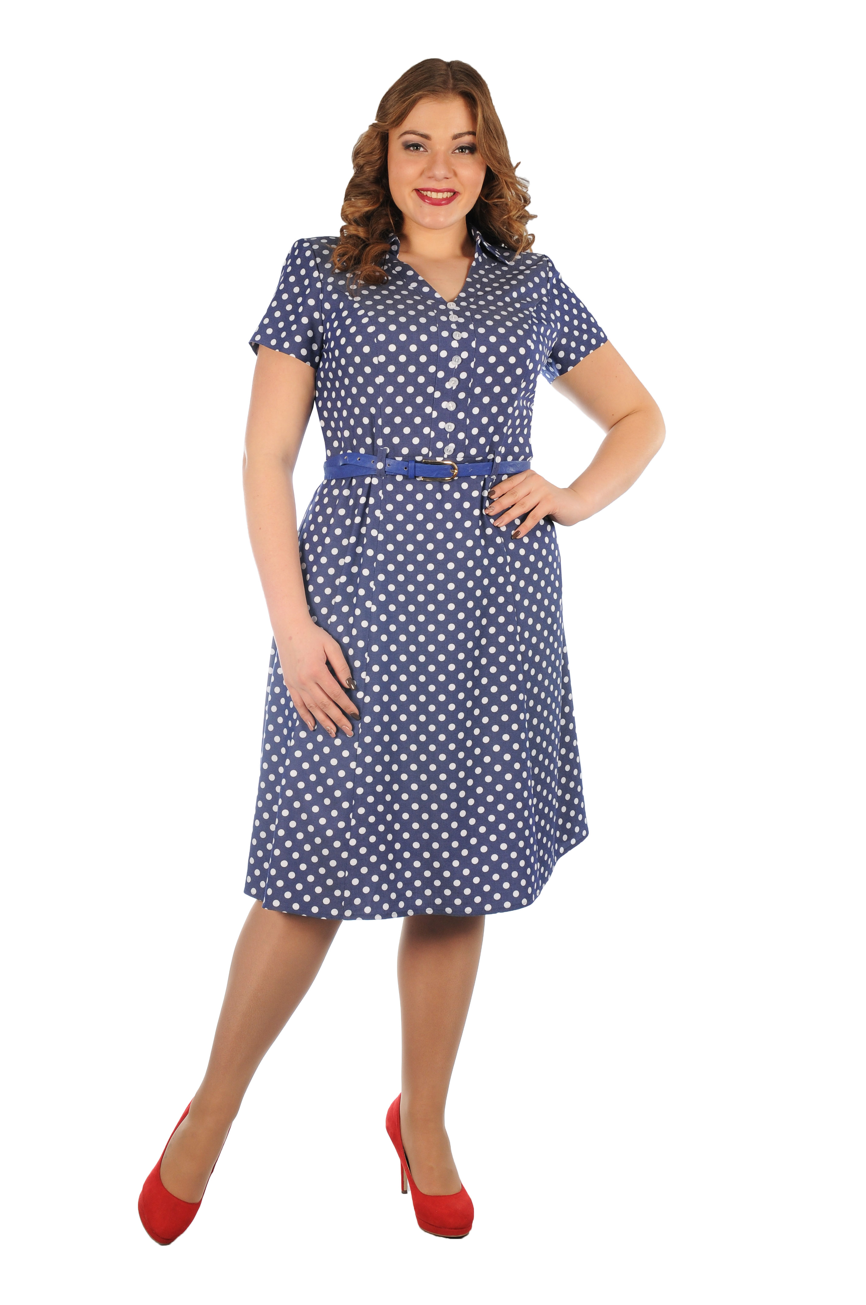 Трикотажное платье полуприлегающего силуэта, расширенное к низу. Короткий рукав, округлый вырез горловины, на талии съемный пояс Платье отрезное по талии, на юбке заложены складки спереди и сзади. Длина по спинке 99 см.