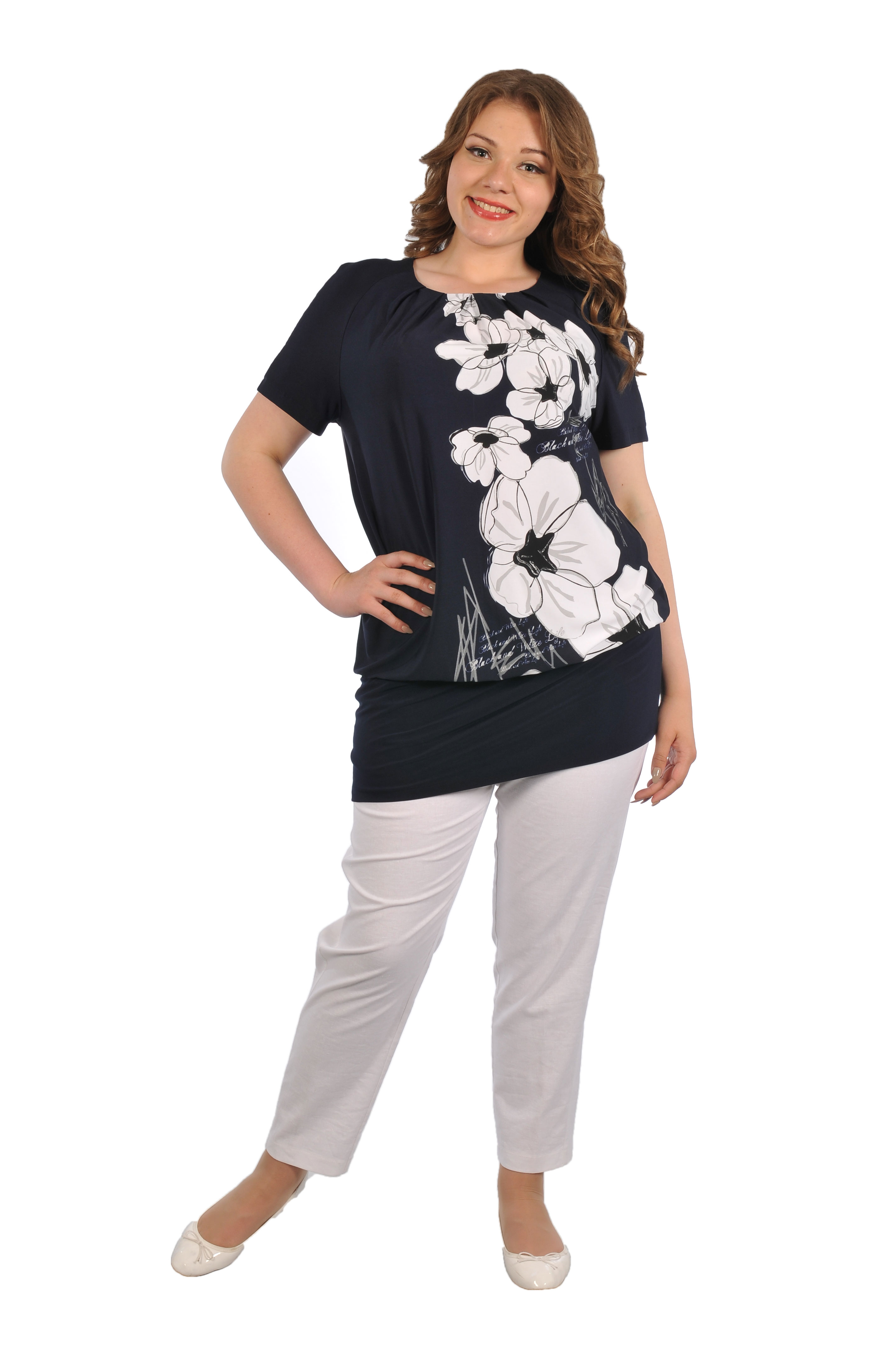 Туника выполнена из плотного масла с рукавами реглан и не большими складками по горловине, что придает легкий и непринужденный вид. Благодаря свободному фасону и широкому манжету по низу идеально сочетается с брюками и легинсами. Удачное расположение контрастного рисунка выгодно смотрится на любой фигуре. Длина по спинке 85 см.